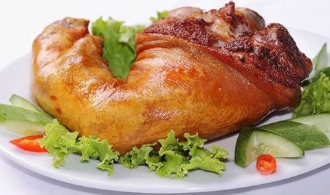 Chân giò quay giòn bì: Phần bì được quay vàng ruộm, giòn tan, thịt bên trong vẫn giữ được độ ẩm, ăn kèm dưa muối thì "hao cơm" vô cùng.