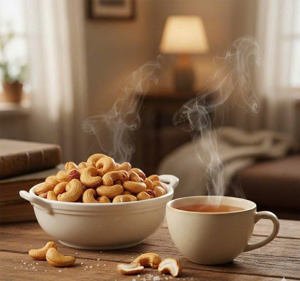 Rang muối truyền thống: Sử dụng muối biển tinh khiết, hạt điều được rang vừa lửa để đạt độ vàng đều, thơm nức mà không bị cháy khét.